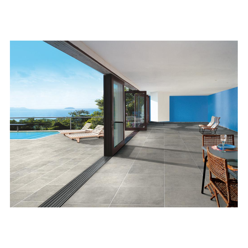 Surowa kolorystyka nowoczesnego miejskiego patio w towarzystwie roślin i minimalistycznych akcentów architektury. Wysoka odporność na plamienie i antypoślizgowość gwarantują wygodne użytkowanie podczas towarzyskich spotkań na tarasie.
