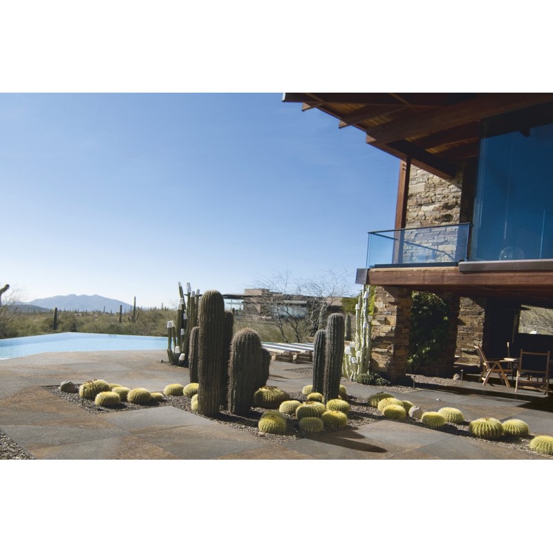 Surowa kolorystyka nowoczesnego miejskiego patio w towarzystwie roślin i minimalistycznych akcentów architektury. Wysoka odporność na plamienie i antypoślizgowość gwarantują wygodne użytkowanie podczas towarzyskich spotkań na tarasie.